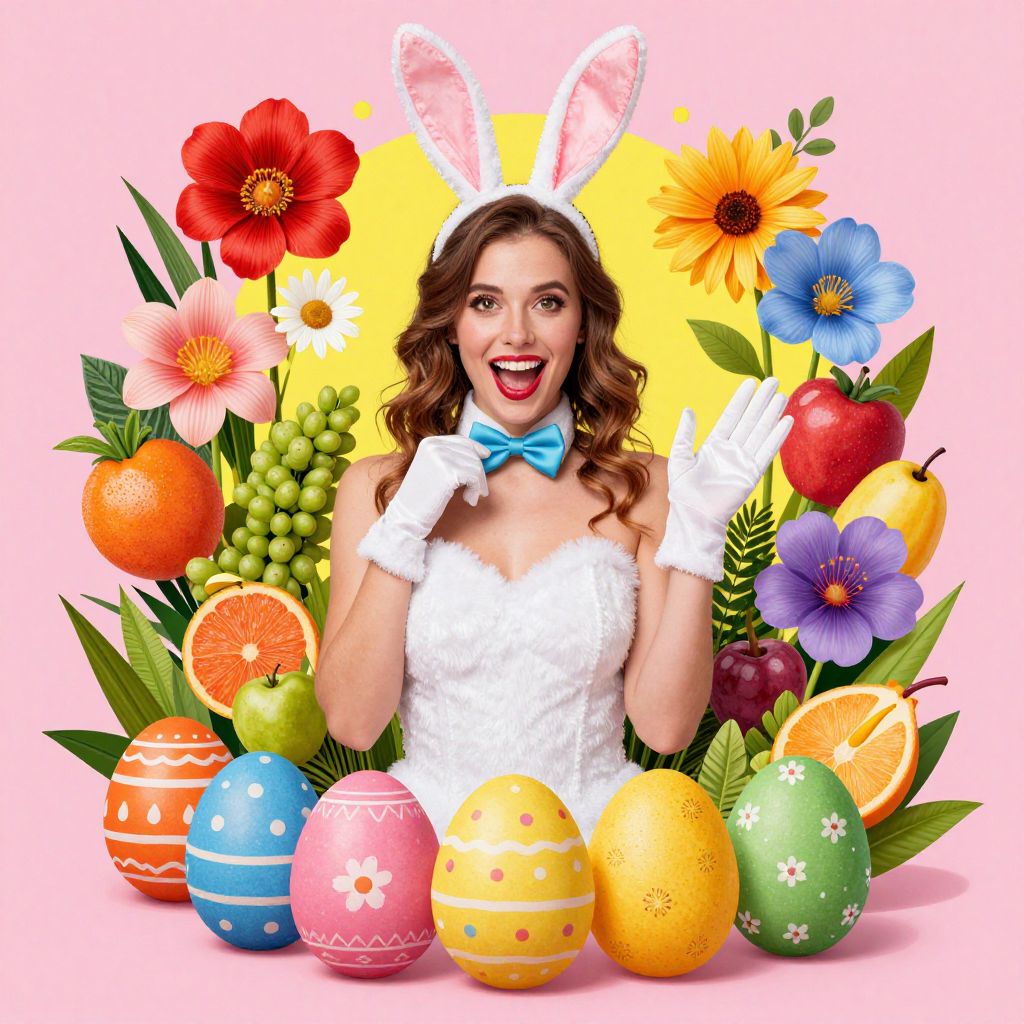 "Woman Easter, woman wearing a bunny hat holding two pink eggs"