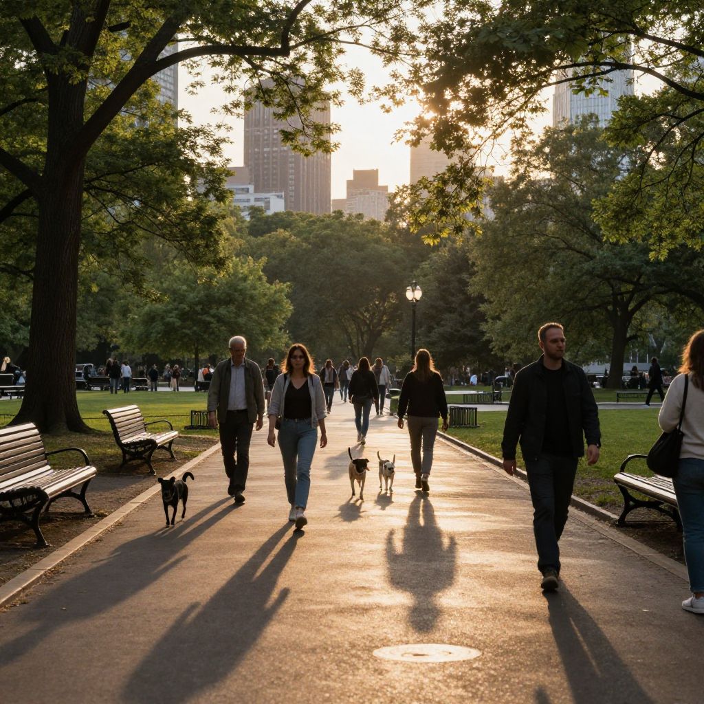 Superhero background realistic illustrating a vibrant city park in early morning light, blending nature with urban elements like benches and lampposts, soft shadows and morning mist creating a peaceful yet dynamic environment, high-resolution realistic style with rich color palette.