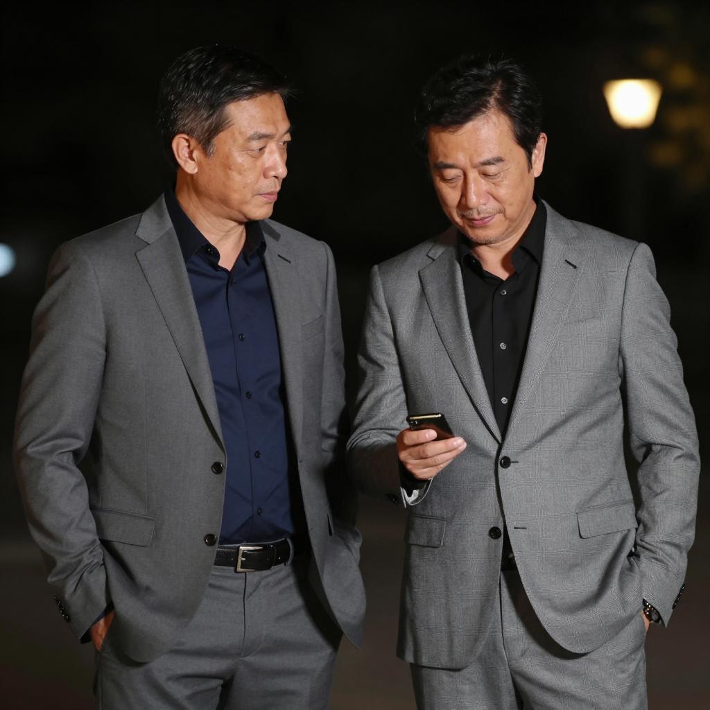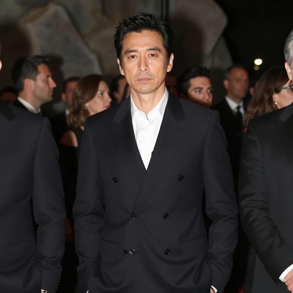 Photograph of an Asian man with dark hair wearing a black double-breasted suit and white shirt, standing in a dimly lit crowd. The man has a serious expression on his face. The background contains numerous blurred indistinct people and rock-like structures.