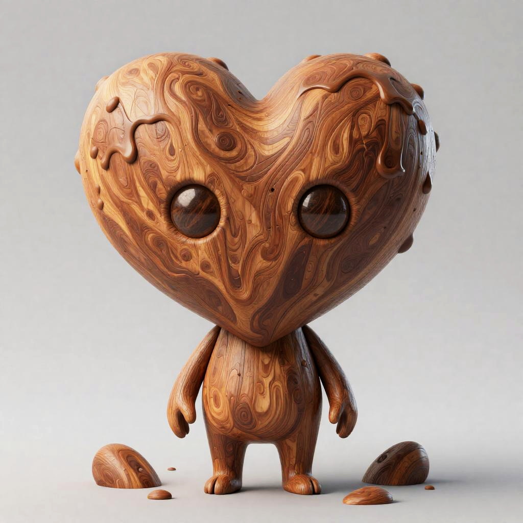 A realistic 3D rendered chibi-style wooden figurine with a heart-shaped head featuring melting effects and large round eyes. The figure has a smooth, polished wood texture with visible grain patterns and stands on a plain grey background with small pieces of wood debris around it.