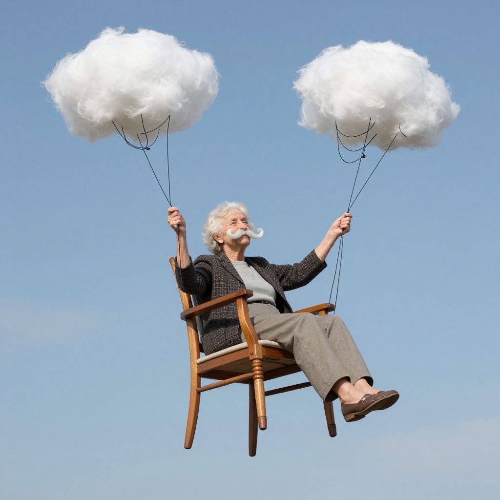 Elderly woman seated in a wooden chair floats gracefully through the sky, suspended by two large clouds connected to her via intricate black wires, her flowing white mustache entwined playfully among them.