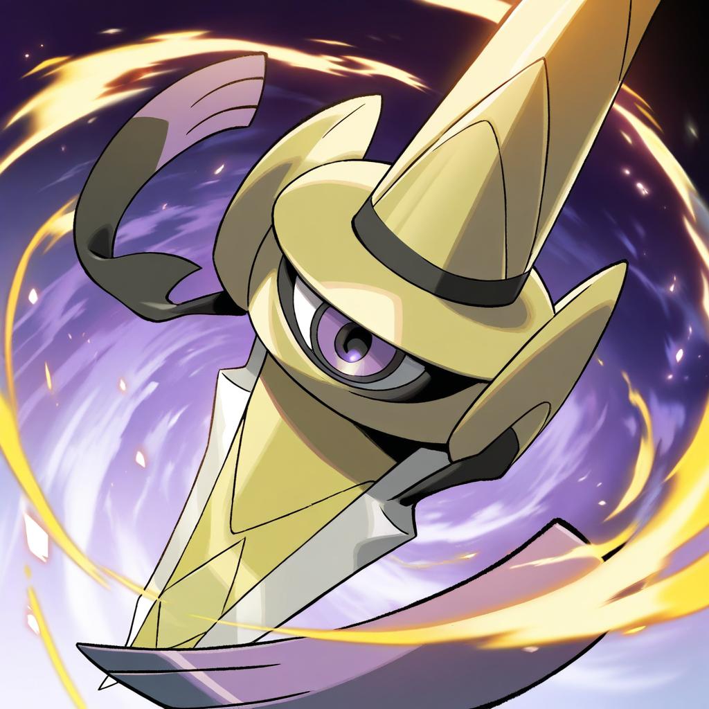 Aegislash, pokemon, no humans, purple eyes, sword, pokemon (creature), one-eyed, by artist fujii masahiro, animagine