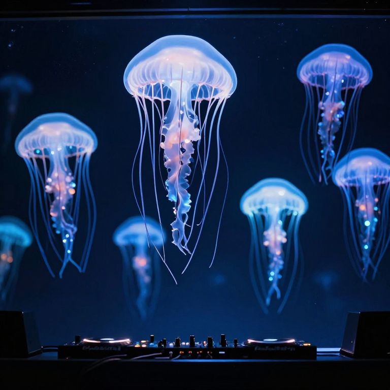 Photograph of vibrant blue and white jellyfish illuminated against a dark background, floating above a DJ console with glowing lights.