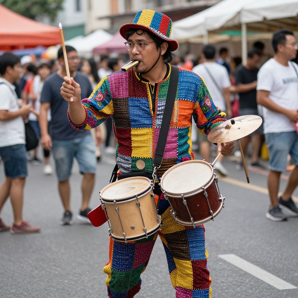 One man band costume featuring a colorful patchwork outfit with multiple musical instruments like drums, cymbals, and a harmonica attached, set in a lively street festival scene, vivid colors, dynamic motion, detailed textures.