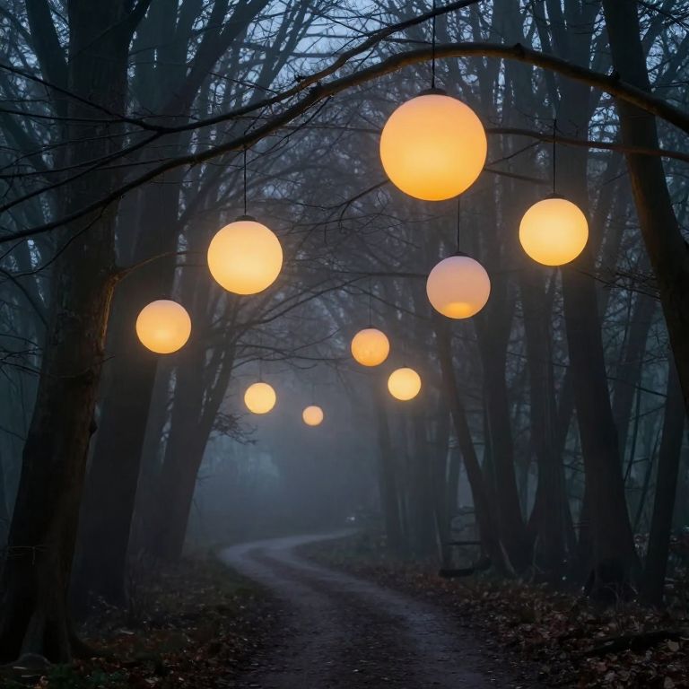Glowing orbs of varying hues hang suspended among bare tree branches in a misty forest, casting ethereal light along a winding dirt path below.
