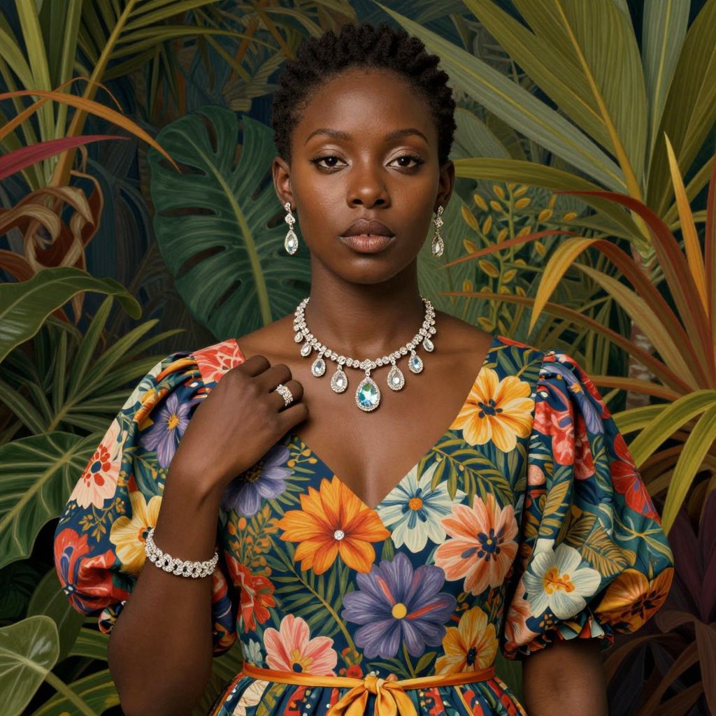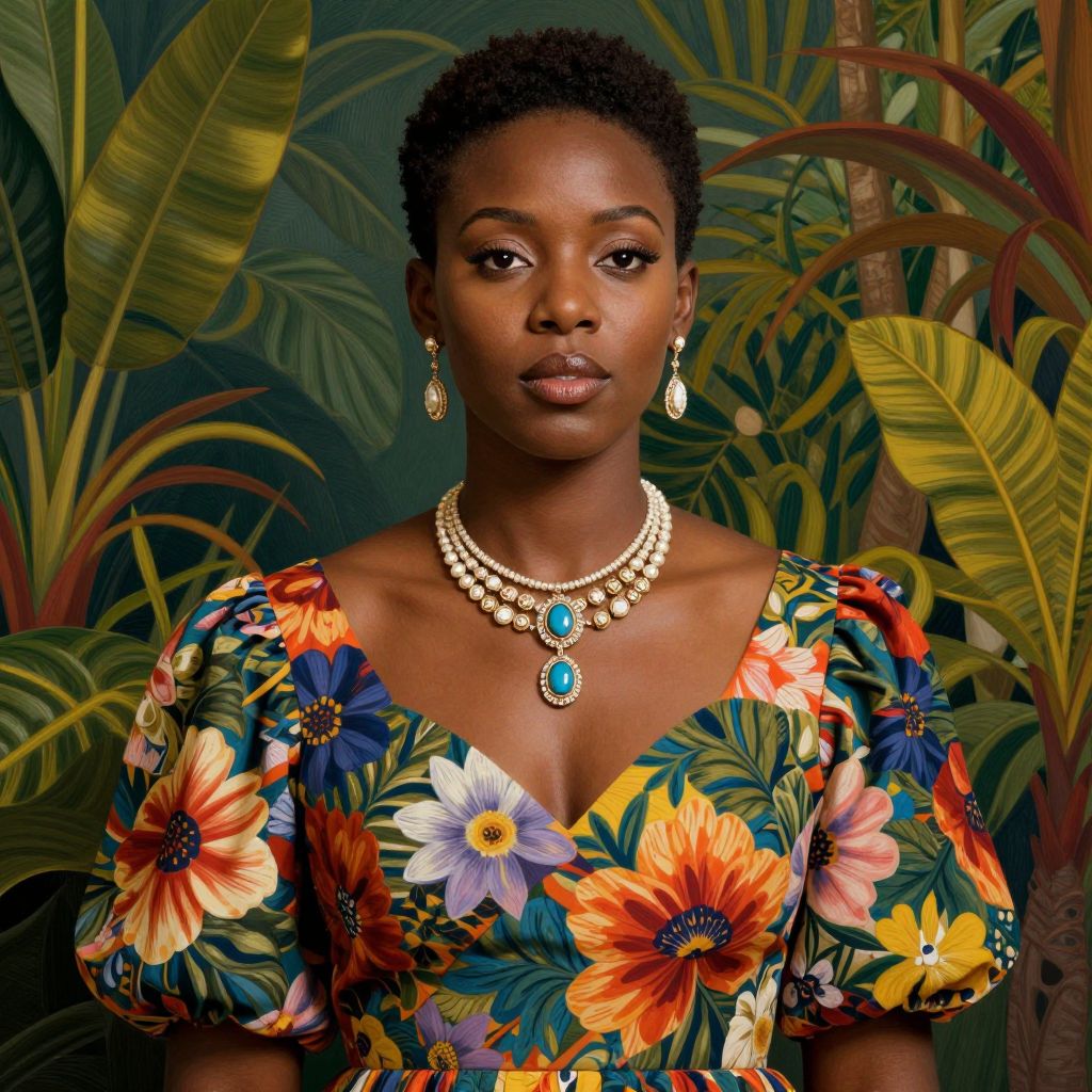 Photograph of an elegant African woman with dark skin, short curly hair, wearing a vibrant floral dress and turquoise jewelry, set against lush tropical foliage.