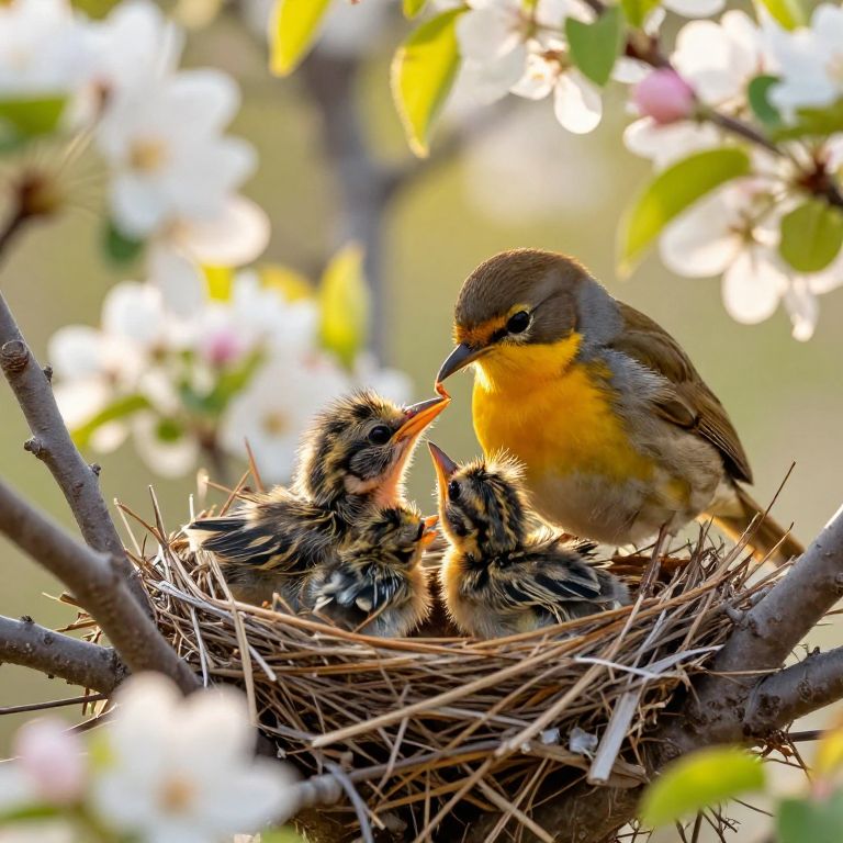 A tiernos portrayal of a mother bird feeding her chicks in a natural nest amid blossoming branches, golden hour sunlight filtering through leaves, emphasizing delicate bonds and the beauty of nature's care in vibrant colors.