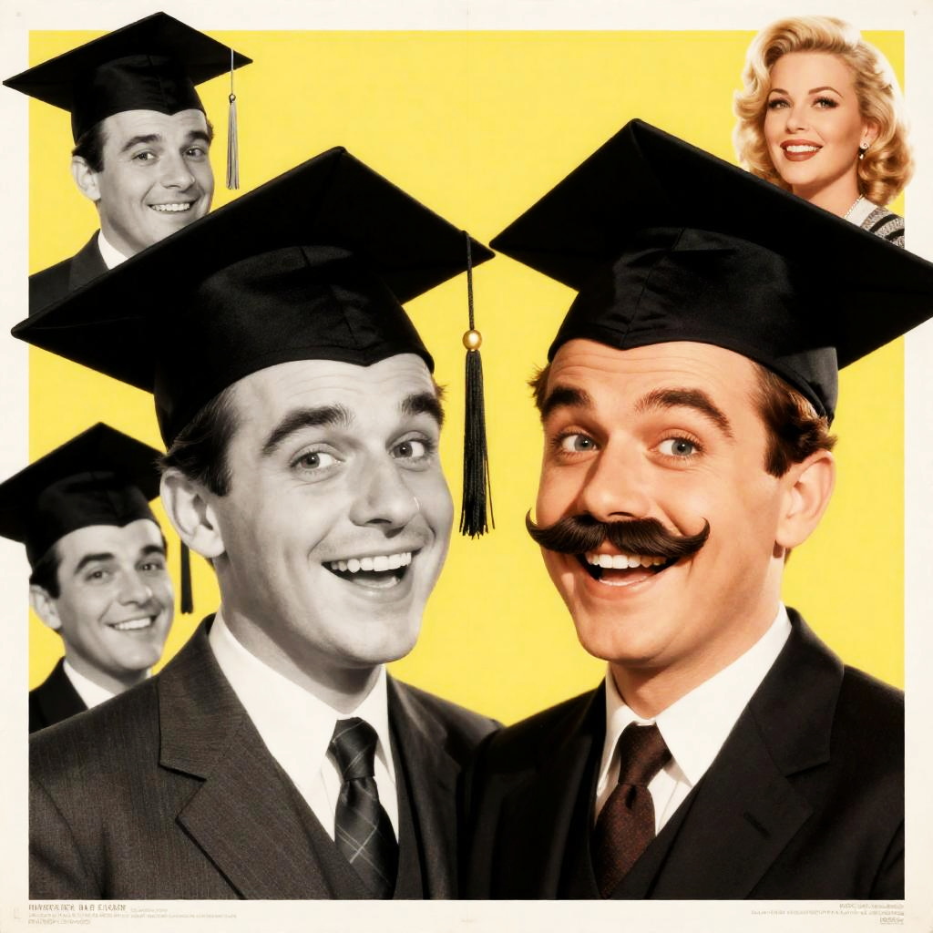 Vintage movie poster. Two cartoon men in graduation caps smile, one on the right with a prominent mustache. Left, two black-and-white photo men in hats and suits. Background yellow with additional cartoon characters. One woman with blonde hair in upper right corner. Bold, stylized in center. Multiple expressions of happiness.