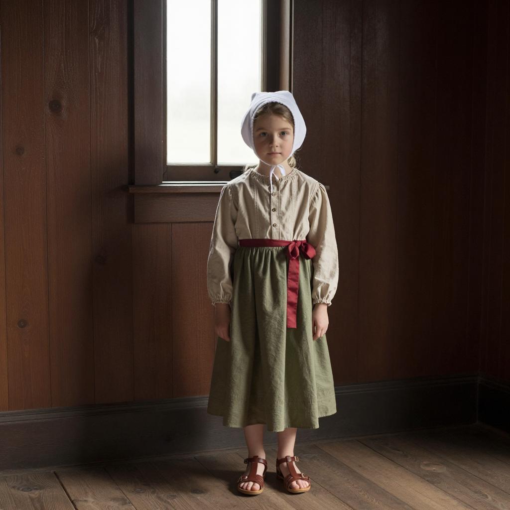 Colonial village girl kid, photograph of a young girl, standing in a dimly lit room, facing camera, traditional Victorian-era child's dress, beige long-sleeve dress with red ribbon belt, olive green skirt, brown sandals, white bonnet, dark brown wooden paneling on walls, narrow vertical window behind her, natural light, soft shadows, neutral expression, cute, realistic style, historical costume, child modeling, antique, period clothing, vintage fashion, standing on wooden floor