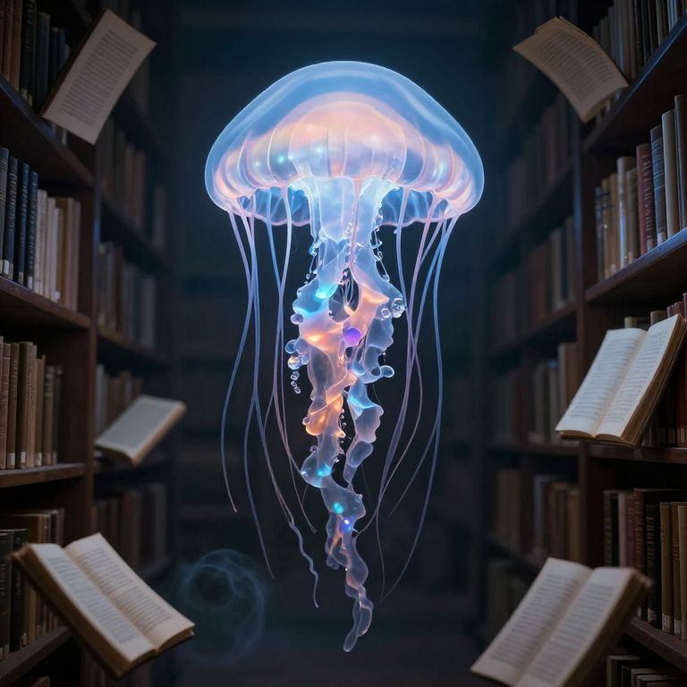 Giant jellyfish with crystalline brains drift through a library of smoke-filled pages, reading minds as they go.