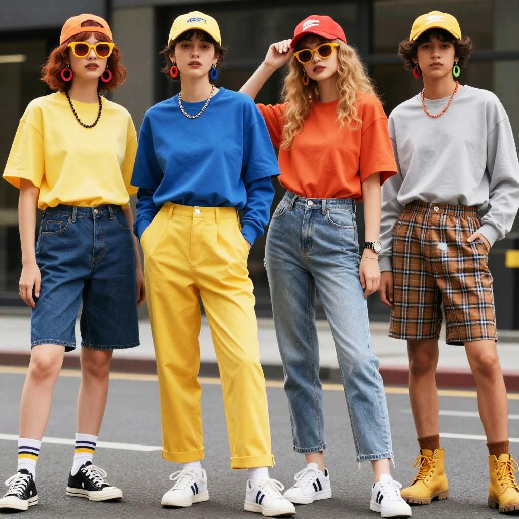 Photograph of four stylish young women standing on a city street. They wear colorful, oversized T-shirts (yellow, blue, orange, and white) paired with high-waisted, loose-fitting denim or plaid shorts. Each wears a baseball cap (yellow, red, and beige) and oversized yellow sunglasses. Accessories include red earrings, necklaces, and bracelets. Their footwear includes white sneakers, black-and-white sneakers, and yellow boots. The background shows a blurred urban setting with buildings and a street. The women have varied hair colors (red, blonde, curly, and dark curly), and their poses are casual and confident. The image has a vibrant, fashion-forward, street-style aesthetic.