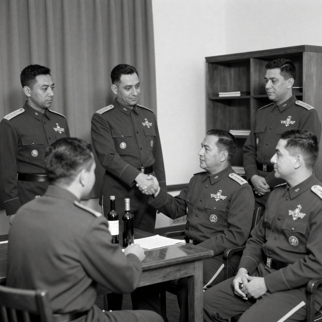 Black-and-white photograph of six male military officers in dark uniforms, standing and sitting in a room with a curtain and shelves in the background. One officer is shaking hands with another, while the others observe. The room has a wooden table and chairs, with a few bottles on the table. The officers have short hair and wear various insignias.