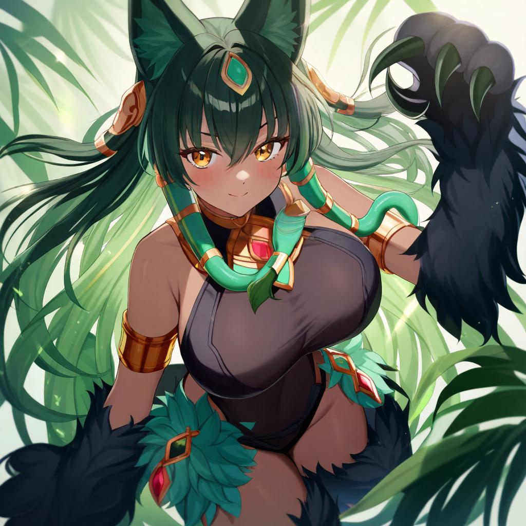 Anubis (monster girl encyclopedia), monster girl encyclopedia, 1girl, monster girl, dark-skinned female, wolf ears, wolf tail, tail, jackal ears, red eyes, green eyes, long hair, green hair, black hair, snake hair ornament, large breasts, animal hands, claws, by artist tinker bell (pixiv 10956015), illustrious