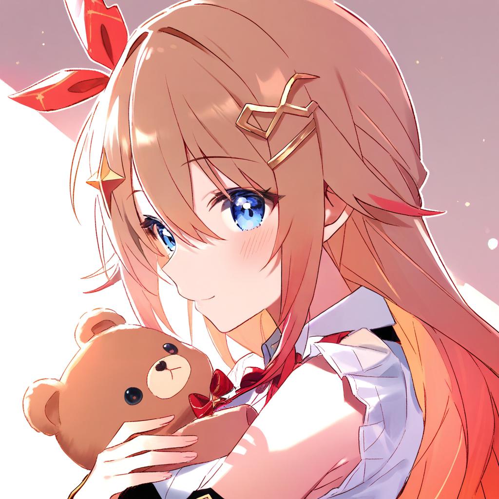 Ankimo (tokino sora), hololive, 1girl, blue eyes, hair between eyes, brown hair, long hair, star hair ornament, hair flaps, hair ribbon, hairclip, medium breasts, white shirt, pleated skirt, sleeveless shirt, red ribbon, virtual youtuber, virtual youtuber, teddy bear, by artist 6 (yuchae), animagine