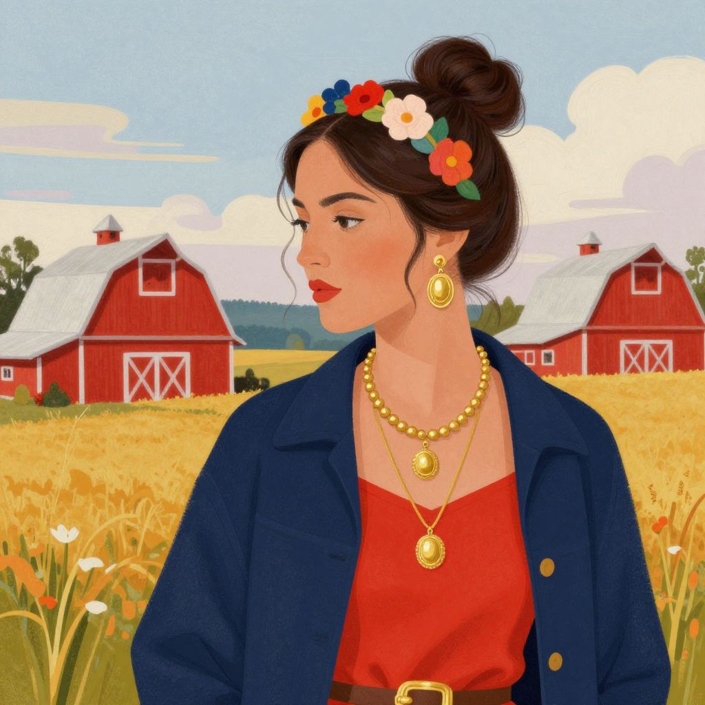 A vibrant mixed-media illustration featuring a woman with dark hair styled in a bun, adorned with a colorful floral headband, elegant gold jewelry, and a layered outfit of a navy jacket and red top, set against a serene rural backdrop with red barns and golden fields under a soft, impressionistic sky.