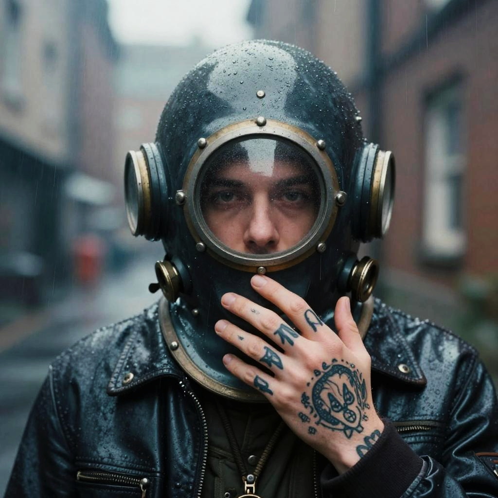 Film aesthetic, Surreal portrait, man in vintage diver's helmet, glass portholes obscuring face, rain-soaked ambiance, urban backdrop, modern tattooed hand juxtaposed with retro gear, slick black jacket, metallic textures contrasting wet skin, moody blues and grays dominate color palette, evoking a somber, dystopian vibe, deeply atmospheric, cinematic quality, hints of steampunk influence, stylistic blend of historical and contemporary elements., Intimate boudoir photography