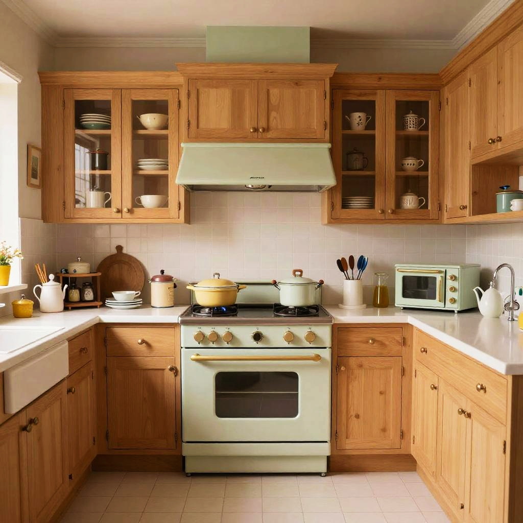 A 60's retro kitchen featuring bold geometric patterns on wallpaper, bright orange and avocado green cabinets, chrome accents on furniture and appliances, classic diner style stools, a shiny Formica countertop, and warm ambient lighting evoking a nostalgic vibe