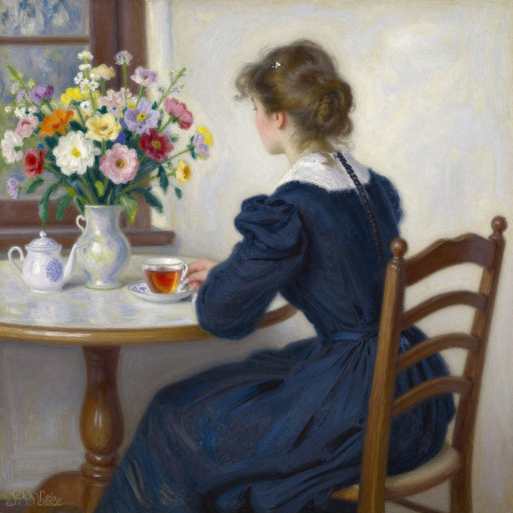 A serene Russian Impressionist-style illustration depicts a woman in a dark blue dress seated at a wooden table, her back turned to the viewer, with a vibrant bouquet of flowers and a cup of tea on the table, capturing the essence of everyday tranquility through soft, natural lighting and detailed brushwork reminiscent of Yuriy Krutov's 1964 works.