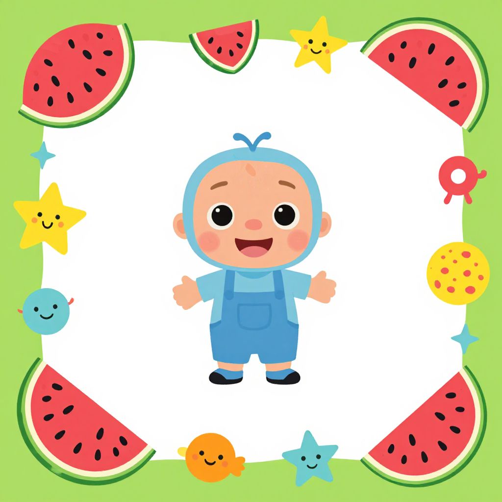 Cocomelon border illustration with a mix of animated watermelon slices, happy children singing, and fun shapes, designed in a cute and engaging style for toddler activity books