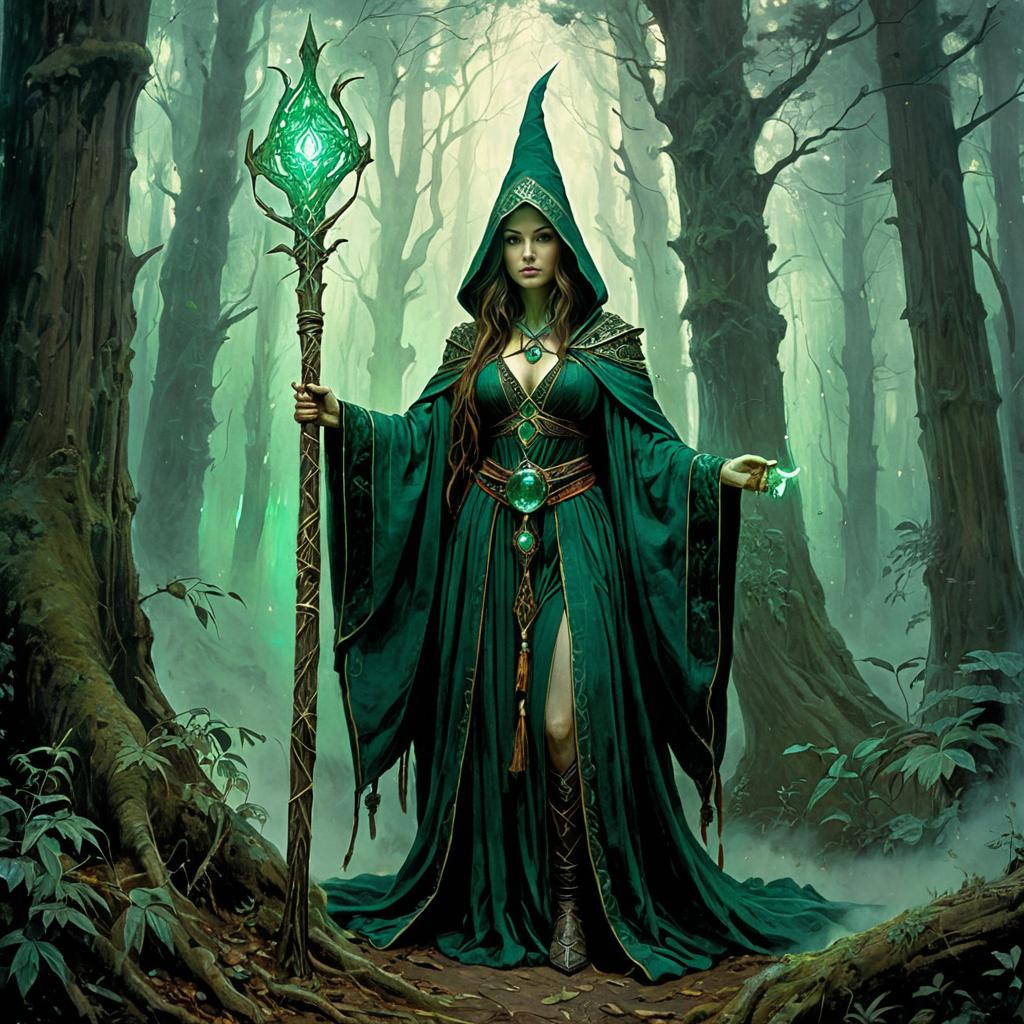 Full-body digital painting of a mystical forest sorceress clad in flowing emerald robes and a pointed hat, holding a glowing staff. She stands confidently in a misty enchanted woodland surrounded by ancient, towering trees. The scene is detailed with a mystical, magical atmosphere, rendered in a smooth and sharp style inspired by fantasy artists.