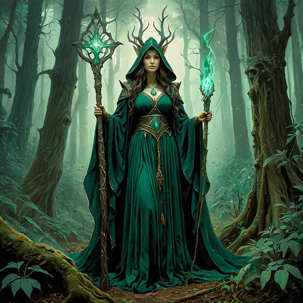 Full-body fantasy portrait of forest sorceress clad in emerald robes holding a glowing staff in misty enchanted woodland with ancient towering trees, digital painting by Brian Froud, Kinuko Y. Craft, Alphonse Mucha, detailed, smooth, sharp focus.