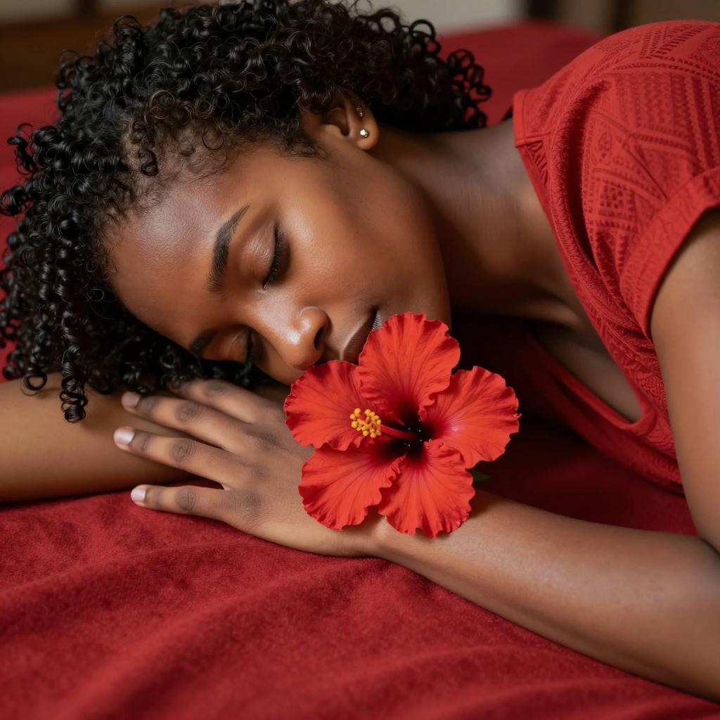 Close-up photograph of a black woman with dark skin and short hair, gazing at a pink hibiscus flower held by a hand on the left. Background includes blurred books and a metallic surface with horizontal lines. Woman's face is in profile, showing a calm expression. Hand with light brown skin is positioned in the lower left, holding the flower near her face.
