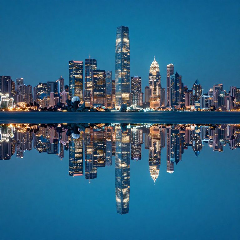 A luminous city skyline mirrors its inverted self beneath a tranquil ocean, where coral-like formations rise like an underwater metropolis, defying gravity and merging the terrestrial with the aquatic in a mesmerizing, dreamlike tableau.
