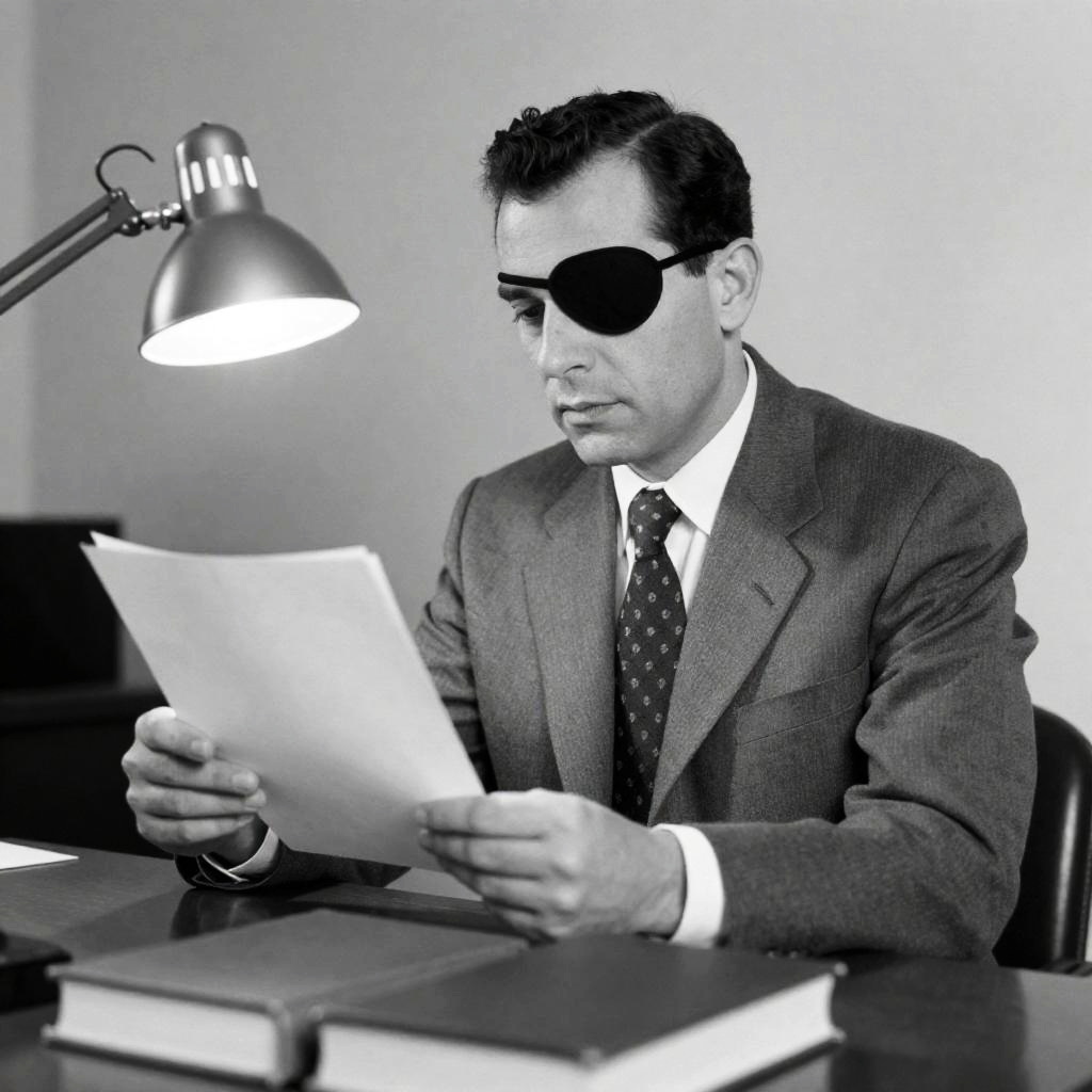 Man in Suit with Eyepatch Reading Papers