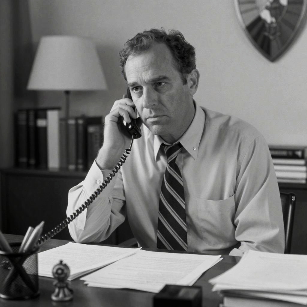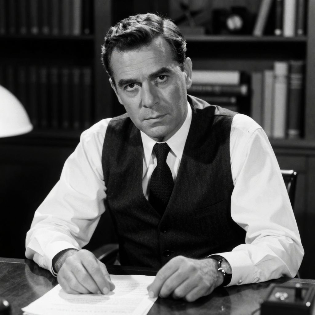 Black and white photograph of a man in a suit with an eyepatch, sitting at a desk, examining papers. He has short dark hair, a serious expression, and is wearing a patterned tie. Desk lamp in background. Three books in front. Office setting.