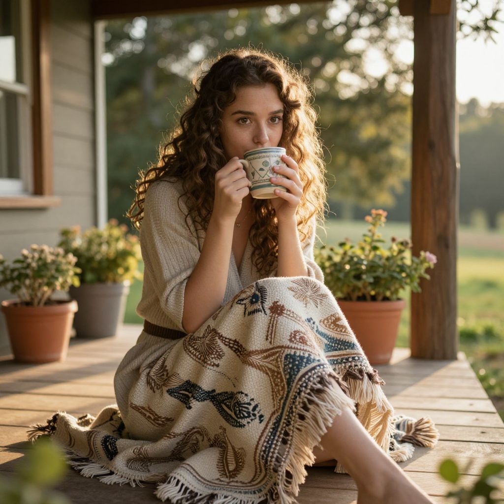 A relaxed picnic vibe in a rural field with a lone woman sitting on a woven cushion, sipping tea from a handmade mug, she has light brown skin and thoughtful eyes, a small wooden lunch box in front of her, scattered wildflowers, soft morning sunlight filtering through the trees, wind gently passing through tall grasses