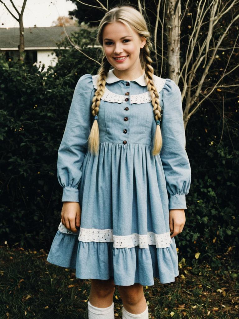 Anabelle costume, 1girl, solo, dress, twin braids, long hair, blonde hair, braid, long sleeves, standing, looking at viewer, full body, jewelry, smile