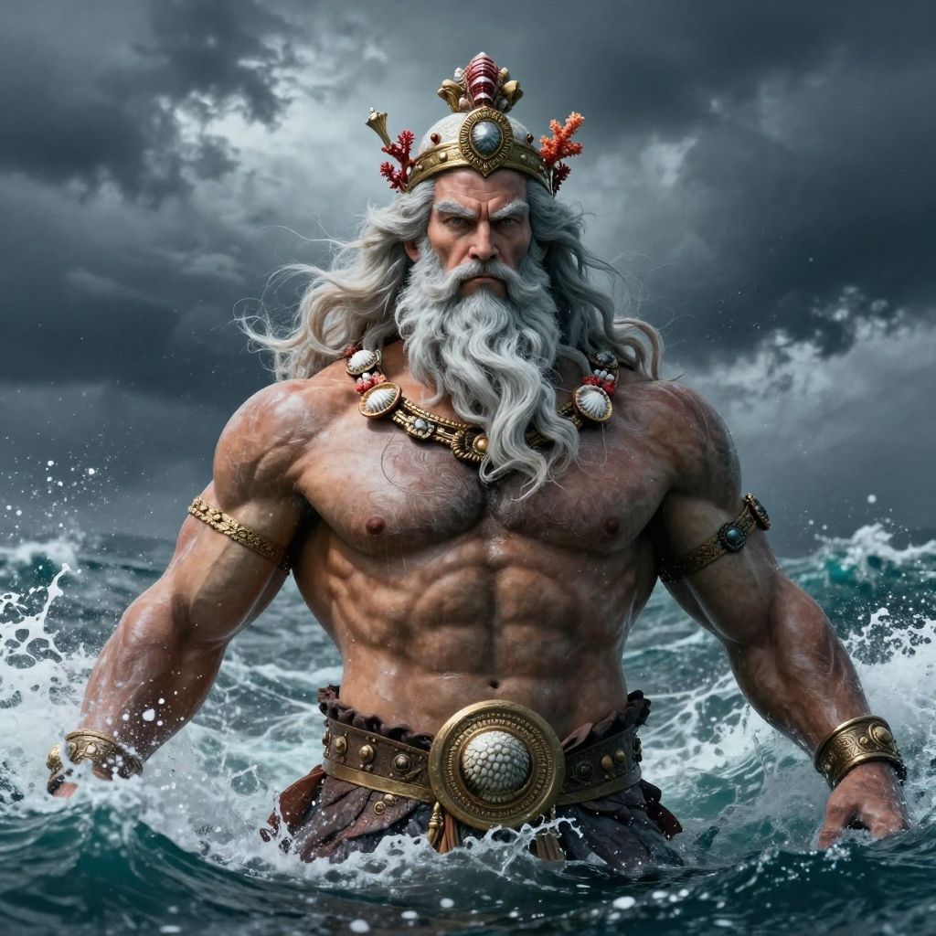 Poseidon's appearance depicted as a powerful ancient deity emerging from the ocean, muscular build, wearing a crown of coral and shells, with a long beard, commanding stormy seas under a dark sky