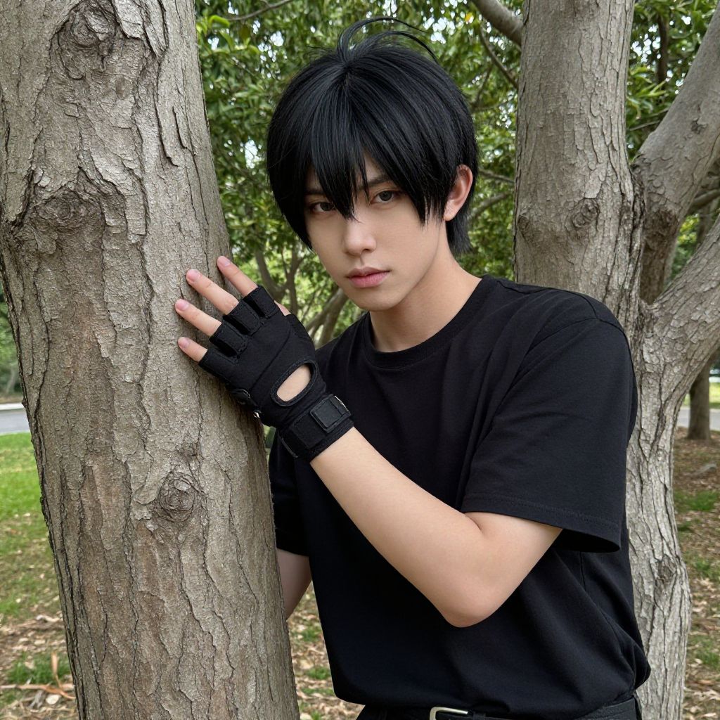 Photograph of an Asian young man with short, black, slightly messy hair standing against a tree. He has a fair skin tone and is wearing a plain black t-shirt and black fingerless gloves. His right hand grips the tree's rough, gray-barked trunk, while his left hand rests beside it. His expression is neutral, with slightly parted lips and dark, focused eyes. The background features green leafy trees and a grassy area with scattered leaves, suggesting a park or forest setting. The lighting is natural, highlighting the textures of the tree bark and the man's smooth skin.