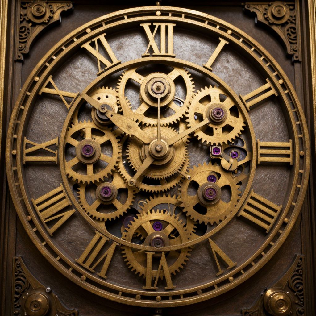 Photograph of a vintage, steampunk-style clock face featuring intricate golden gears and cogs. The clock face displays Roman numerals in gold against a textured, dark brown background. Purple jewels are embedded at the center of some gears, adding a touch of color. The clock hands are also golden, with one hand pointing to the 3 and the other to the 12. Ornate, gold-colored corner details frame the clock, enhancing its antique appearance. The overall style is reminiscent of industrial design mixed with classic elegance.