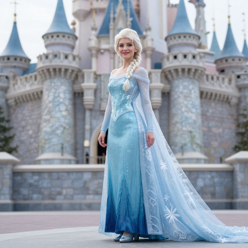 Elsa Frozen Gown, a woman in a blue dress standing in front of a castle