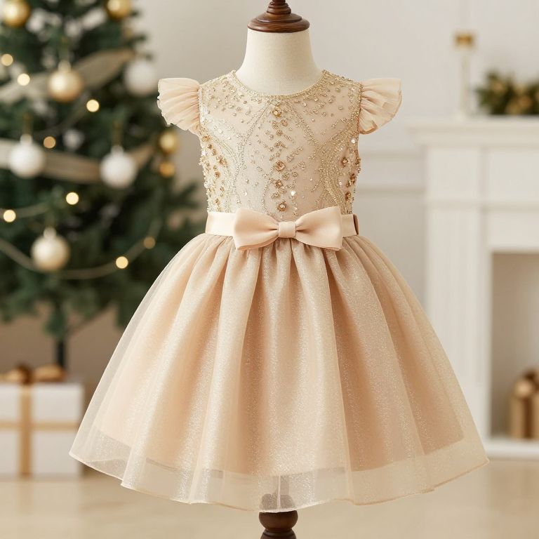 Beige girls' dress with gold glitter embellishments and high-neck design, featuring short ruffled sleeves and a satin bow at the waist. The flared skirt has a soft tulle overlay. Displayed on a dress form with a festive holiday background including a decorated Christmas tree and wrapped gifts.