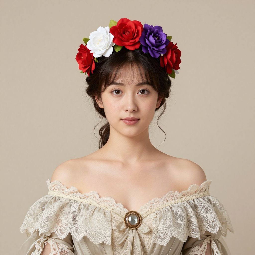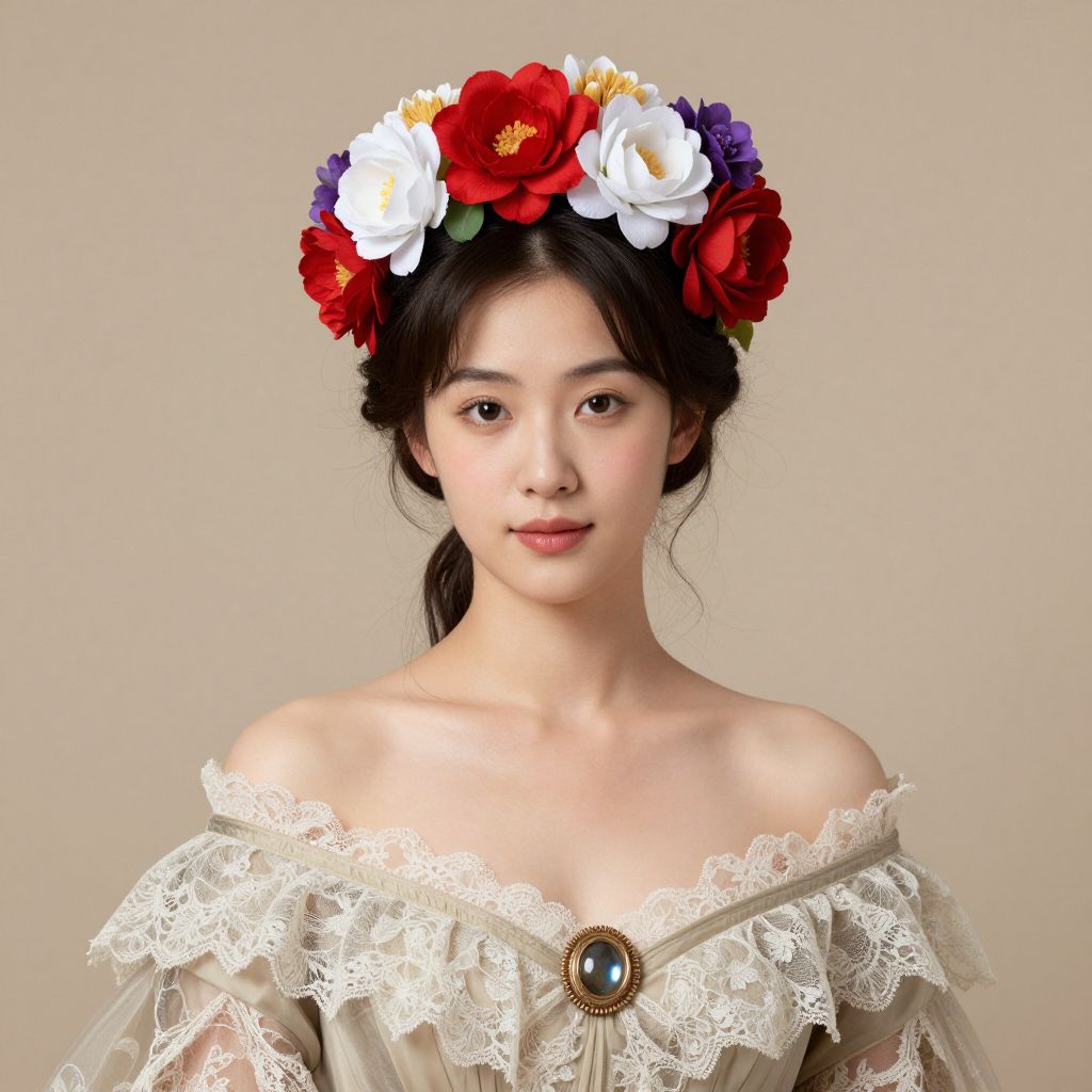 Elegant portrait of a woman adorned with a floral headpiece featuring a vibrant arrangement of red, white, and purple flowers, set against a soft beige background, wearing an off-the-shoulder gown with delicate lace trim and a central brooch accent, rendered in a detailed style reminiscent of 19th-century artistry.