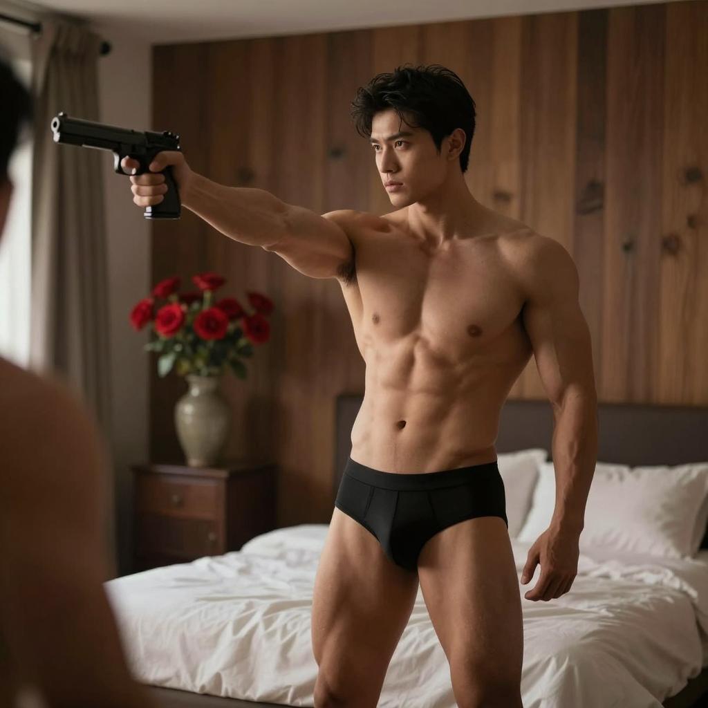 Two muscular shirtless men in a warehouse. Man on left has short dark hair, intense expression, gray pants, bent forward with hands on another man's forearms. Man on right has black hair, back to camera, also shirtless, facing left man. Background includes wooden crates, plastic wrapping, and a yellow caution sign. Both men have defined muscles.