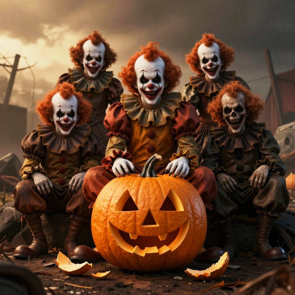 Realistic photo.Five scary clowns sitting around a shattered jack-o'-lantern, apocalyptic atmosphere, dark golden hour mood, hyper-realistic, 8K resolution, cinematic lighting, eerie and detailed realistic photo