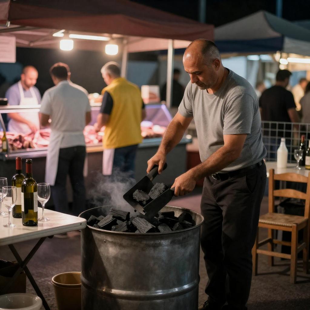 A bald middle-aged man wearing a gray T-shirt and black pants shovels charcoal into a large metal drum at a nighttime street market. In the foreground, there is a table with wine bottles and empty wine glasses. The background features several market vendors, including two men in white aprons behind a meat display and another person in a yellow vest. Warm ambient lighting creates a cozy atmosphere in the outdoor market setting.