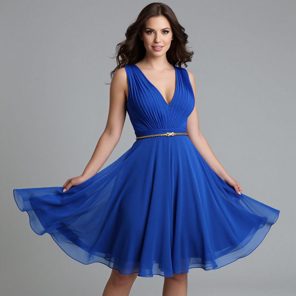 "Woman, vibrant, royal blue sleeveless skater dress, deep V-neckline, pleated bodice, fitted waist with a gold braided belt, flared skirt above knee-length, flowing lightweight fabric.. Sexy. Pretty face and beаutiful eyes. Big breasts."