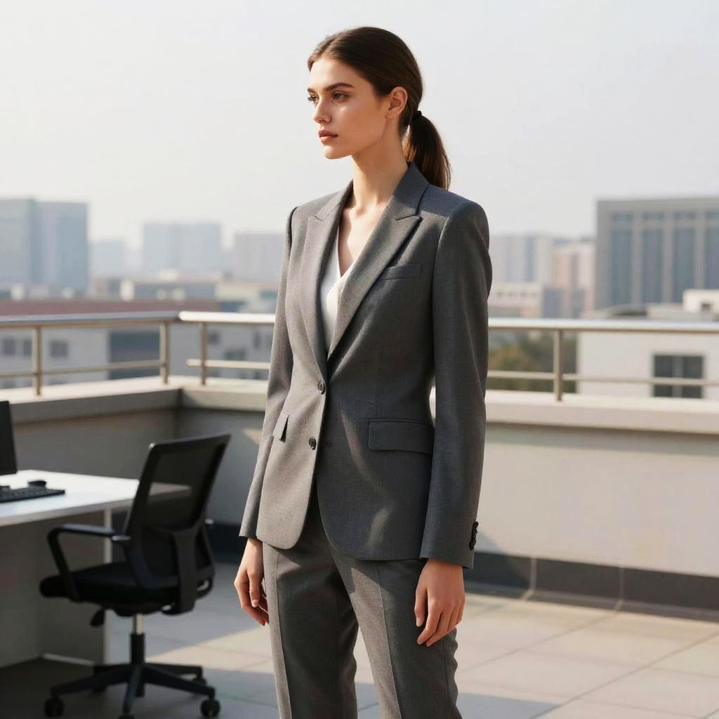 Classic Ponytail hairstyle on fashion model, wearing sharp tailored blazer and pants, in corporate office rooftop, captured in fashion editorial style with crisp morning sunlight.