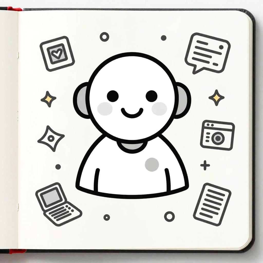 AI doodle of a smart assistant character composed of simple lines and dots, surrounded by digital interfaces and tools, sketchbook style with monochrome shading and subtle color highlights, conveying intelligence and playfulness.