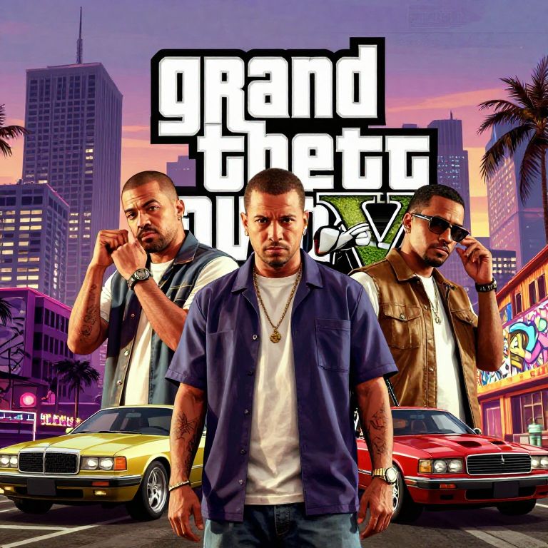 GTA V cover art style composition showing three diverse protagonists in dramatic poses, highlighting a sprawling metropolis with towering skyscrapers, flashy vehicles, and bold graphic overlays, blending street art aesthetics and cinematic lighting for a thrilling vibe.