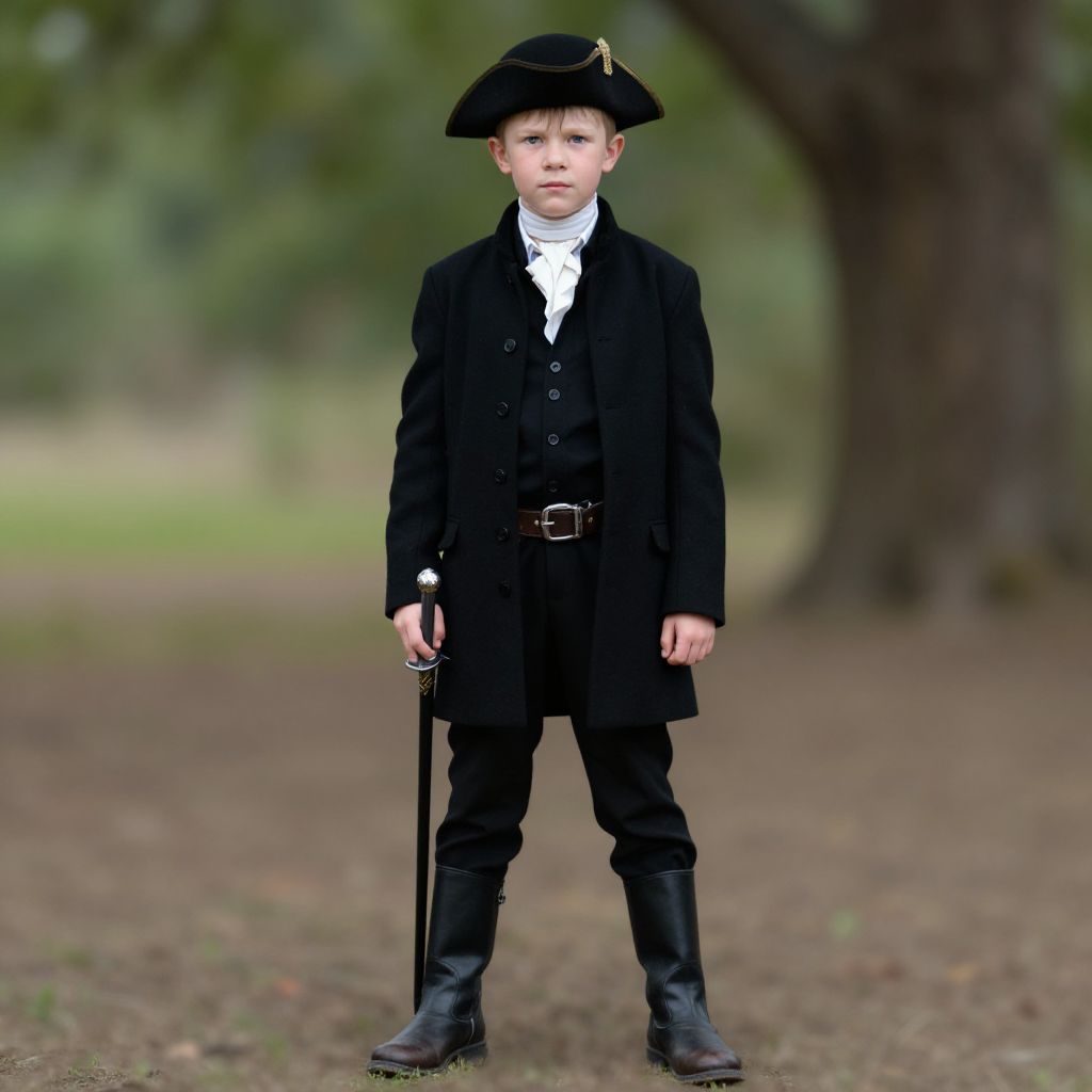 "british redcoat kid costume, 1boy, male focus, solo, hat, outdoors, tree, blurry background, blurry, looking at viewer, long sleeves, standing, day, realistic, belt, red headwear, blonde hair, pants, closed mouth Realistic photo of casual sexy person with pretty face"