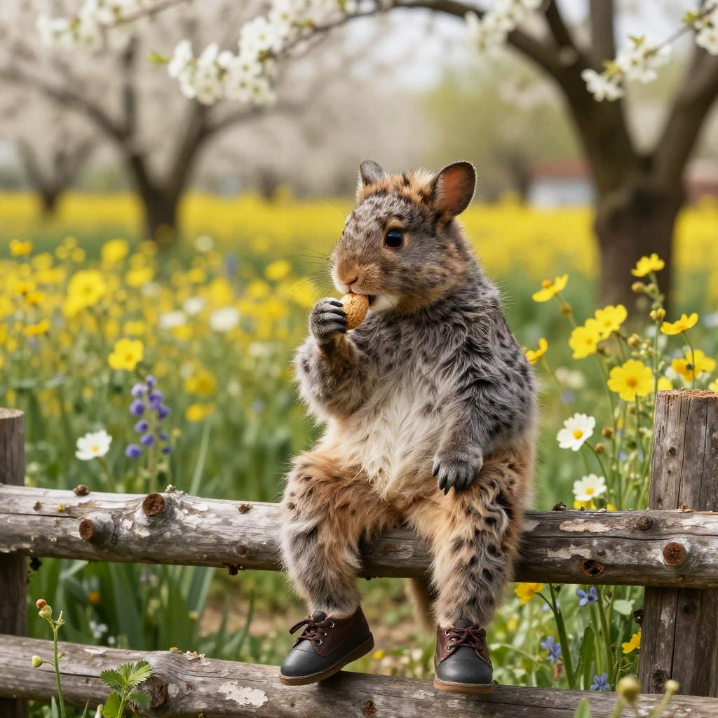 Photograph of a fuzzy, brown and gray, anthropomorphic squirrel with large ears and dark eyes, sitting on a rustic wooden fence in a vibrant meadow. The squirrel, wearing dark brown shoes, is holding a small object to its mouth with both paws. The background is filled with blooming yellow and white flowers, and blurred trees with blossoms. The image has a bright, sunny atmosphere, with sharp focus on the squirrel and a softly blurred background. The overall scene exudes a whimsical, springtime vibe.