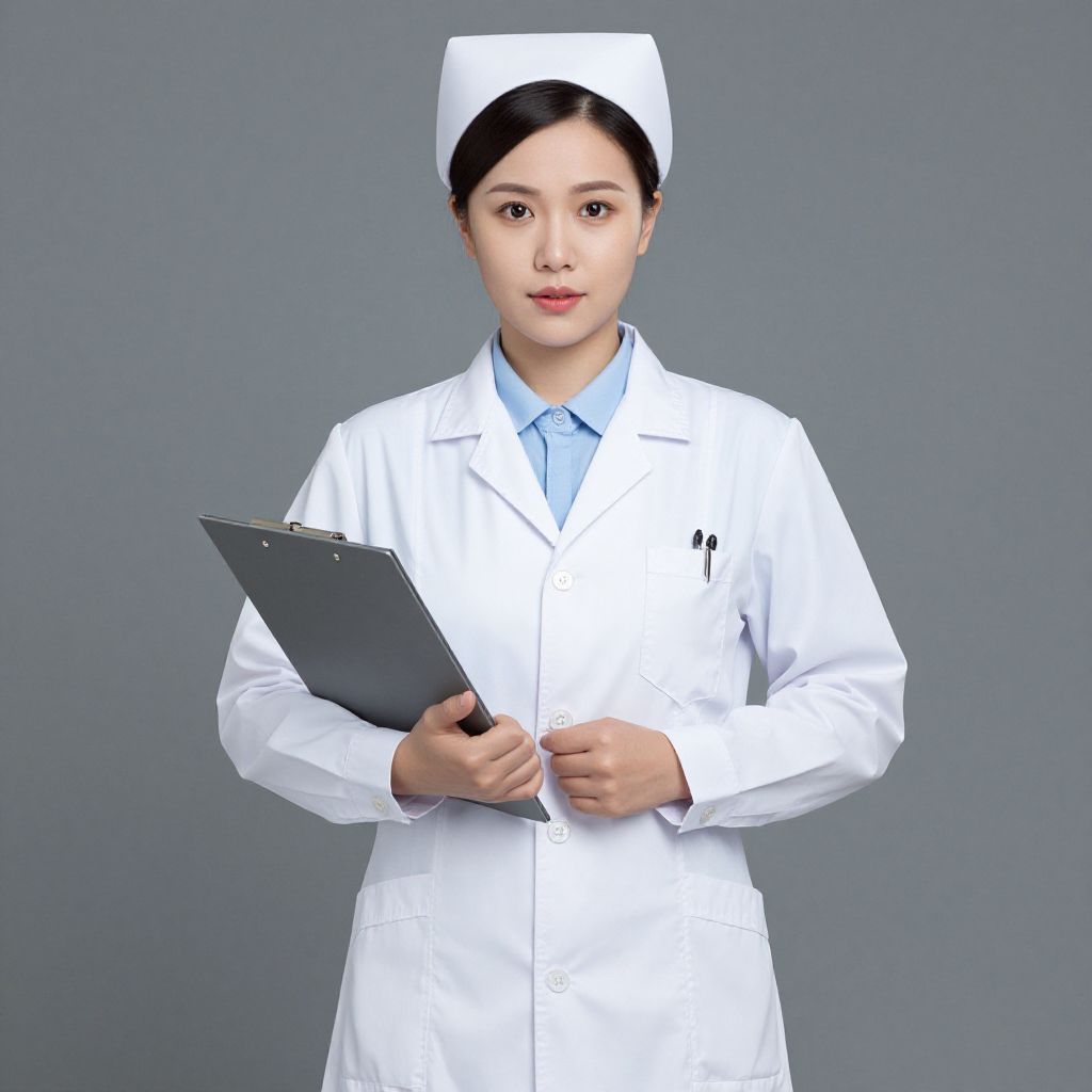 Photograph of an Asian female nurse with dark hair, wearing a white uniform, cap, and holding a black clipboard, standing against a gray background.