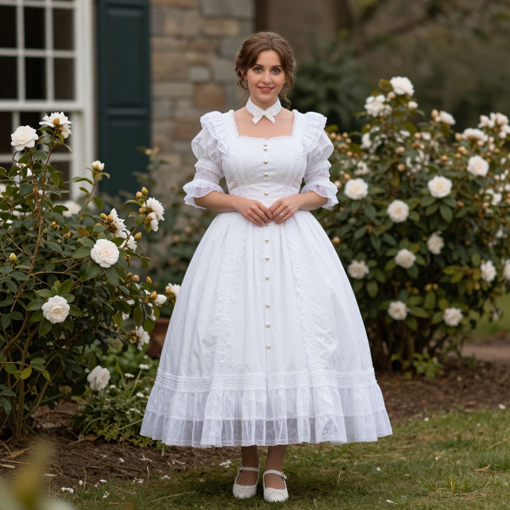 Photograph of a woman standing in a garden, wearing a white, Victorian-style dress with puffed sleeves, a high neckline, and a lace trim at the hem. The dress has buttons down the front and a white collar. She has dark brown hair styled in an updo and is smiling. She wears white shoes. The background includes a stone house with a dark green door and window, surrounded by blooming white roses and green foliage. The grass underfoot is lush and green. The lighting is natural, suggesting an outdoor setting.