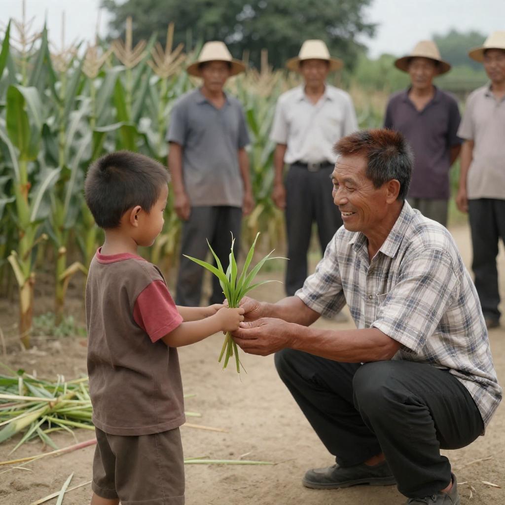 In a rural farmland setting, an older man wearing a plaid shirt kneels and smiles while handing a young boy, dressed in a brown and red shirt, a small bundle of green stalks. Four older men wearing hats and simple clothing stand in the background near rows of tall cornstalks. The dry, sandy ground and green foliage reflect a countryside agricultural environment.