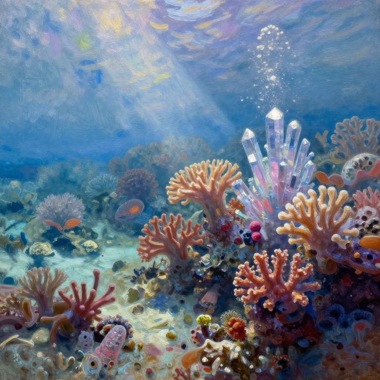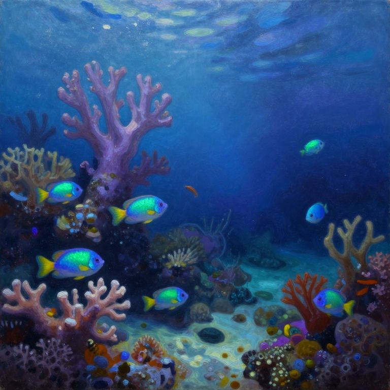 An enchanting oil painting captures the captivating allure of an underwater world from an 'ant's-eye view'. The artwork showcases intricate coral formations and iridescent fish in vibrant hues of blue, purple, and green against the dark backdrop of the ocean floor, evoking a dreamlike atmosphere. Rich textures and soft brushstrokes convey enchantment, inviting viewers to explore this hidden marine realm and experience an emotional gradient between tranquility and wonder.